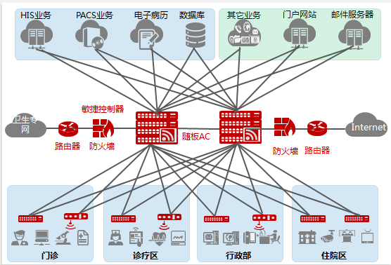 內(nèi)網(wǎng):也稱為HIS網(wǎng)絡(luò),主要承載醫(yī)療核心業(yè)務(wù),如HIS、LIS、PACS等業(yè)務(wù)數(shù)據(jù)傳輸,要求高寬帶、大容量和高速率,并需考慮未來擴容、帶寬升級。